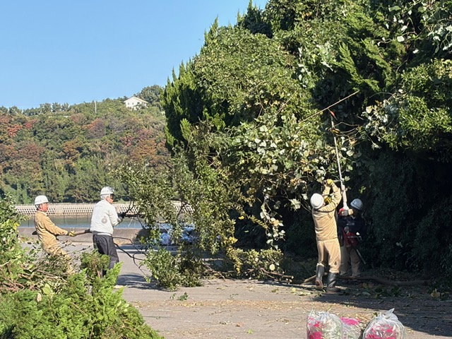 今回活動した場所は香々地漁港(貴船地区・新波止地区・高島分区)の3ヶ所です。40名を超える人員が集まり、各地区に分散して作業を行いました。弊社より参加した4名は貴船地区にある漁協事務所裏の雑木伐採作業を担当しました。